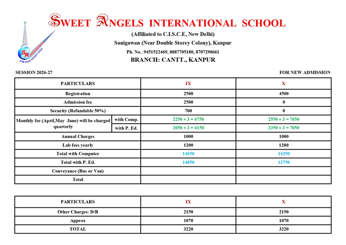 Access the comprehensive fee schedule for the upcoming academic session at Sweet Angels International School. View detailed breakdowns for Registration, Admission, Security, Monthly Tution fee, Annual Charges, Lab fee, and Computer / P.Ed of Class IXth and Xth. Transparent education starts here.