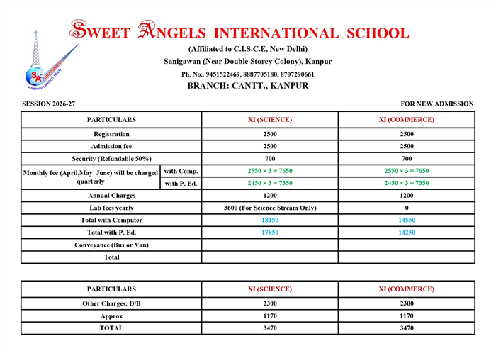 Access the comprehensive fee schedule for the upcoming academic session at Sweet Angels International School. View detailed breakdowns for Registration, Admission, Security, Monthly Tution fee, Annual Charges, Lab fee, and Computer / P.Ed of Class XIth. Transparent education starts here.